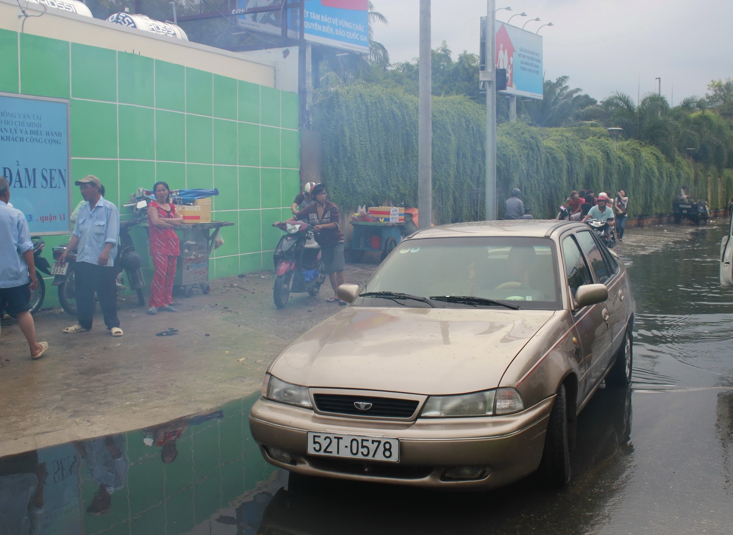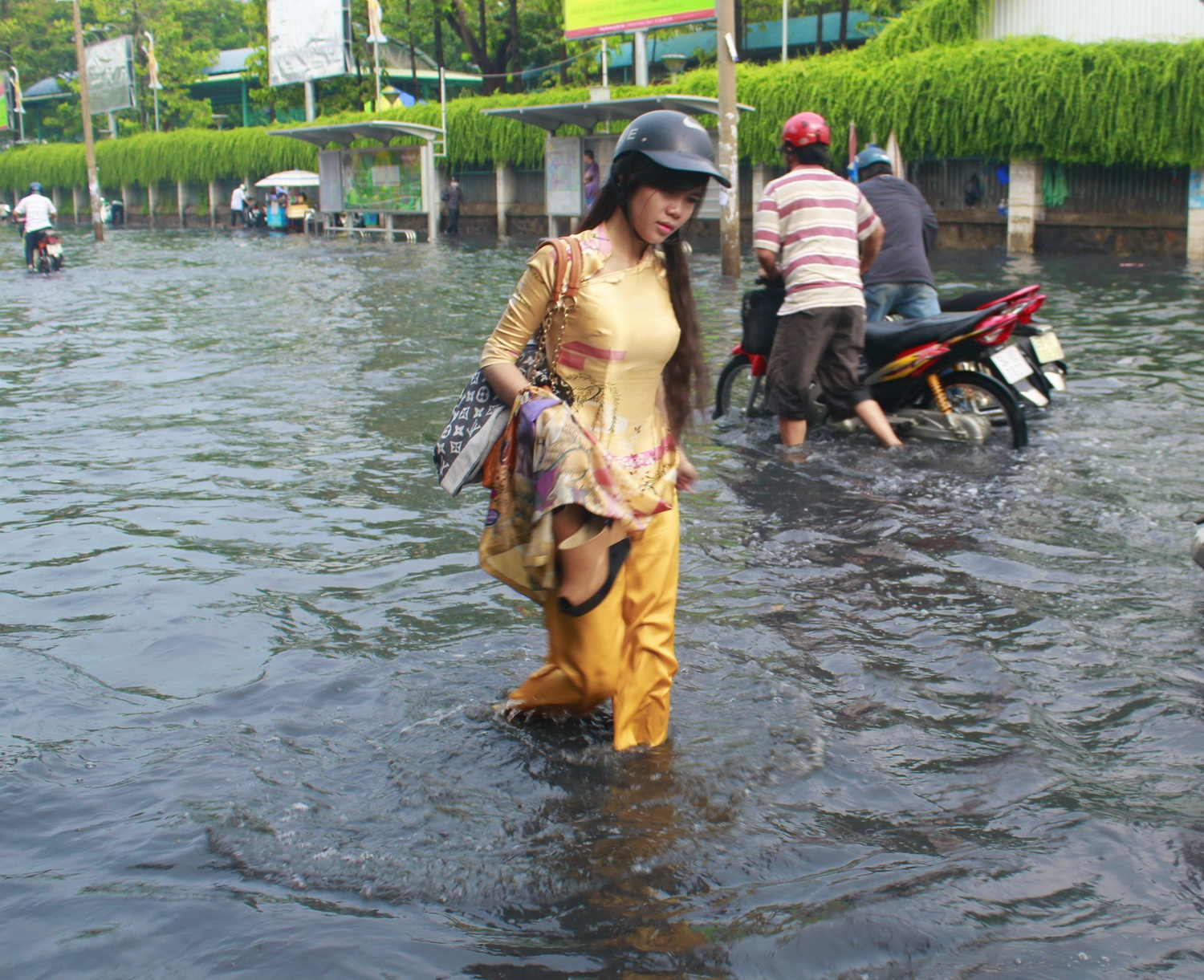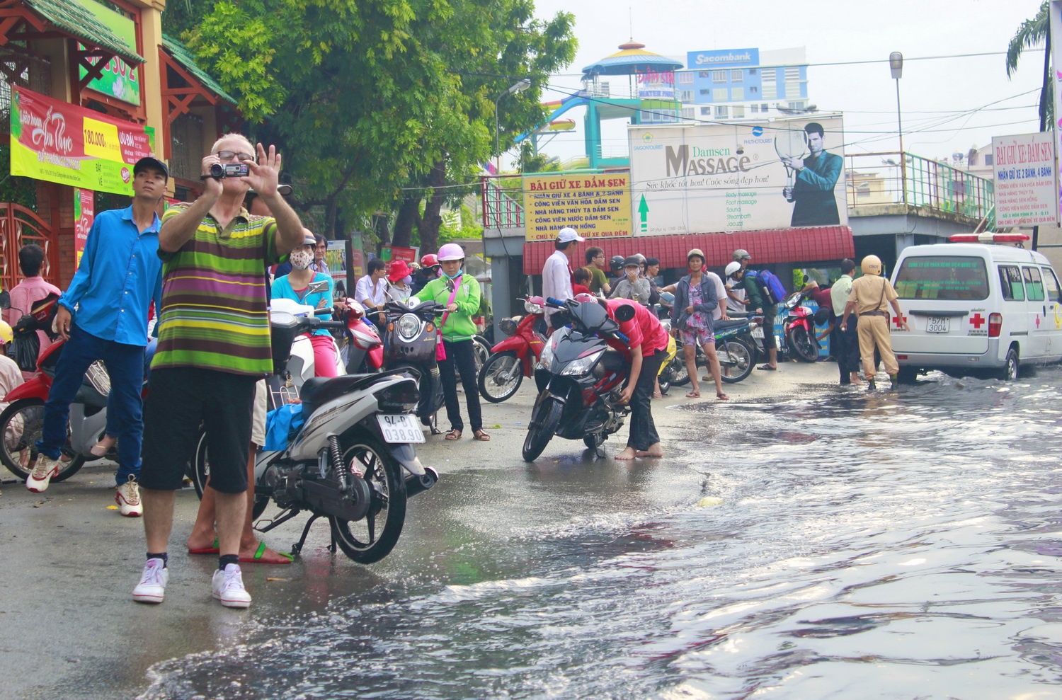 Trải nghiệm thú vị về ngập nước ở Việt Nam của một khách du lịch nước ngoài trước Công viên Đầm Sen.