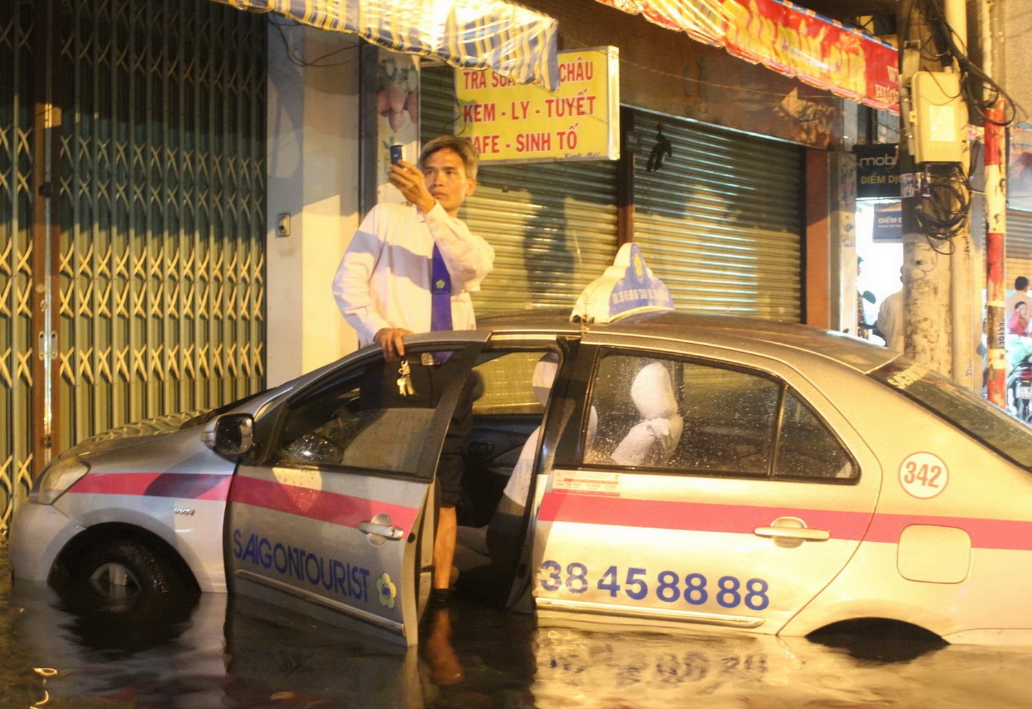 Lưu giữ khoảnh khắc xe của mình bị ngâm nước và đứng trong xế của công ty chụp ảnh mọi người đang bì bõm trong biển nước.