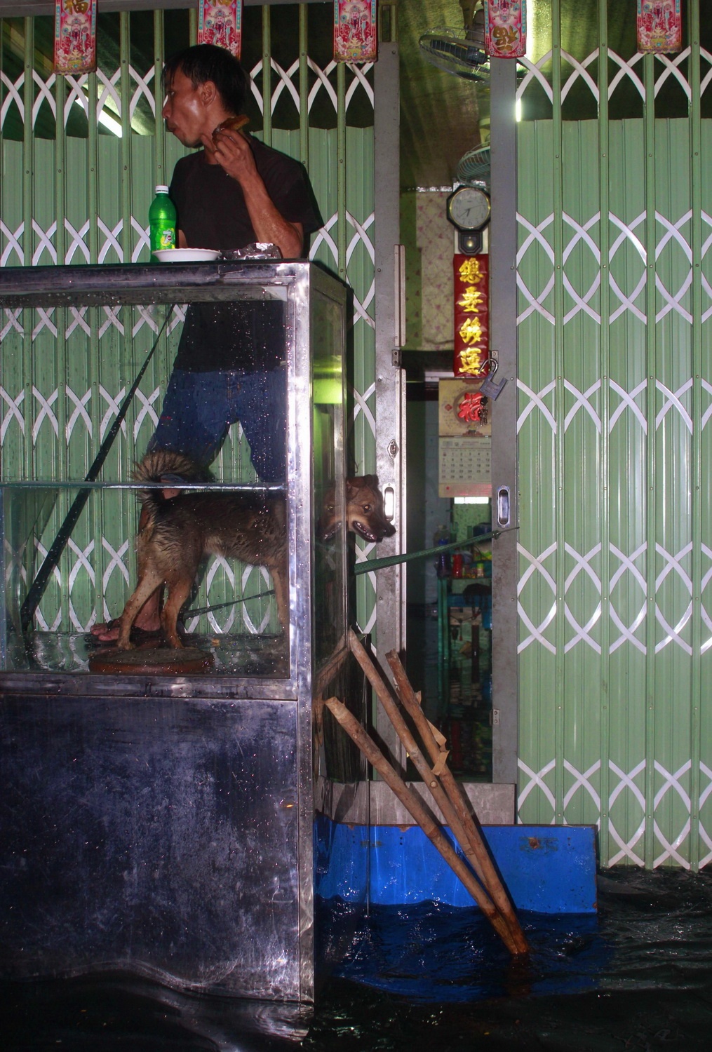 Trong khi một chú khác bị mưa, sóng nước làm ướt sũng hết lông, phải đứng lánh cùng chủ trên cao.