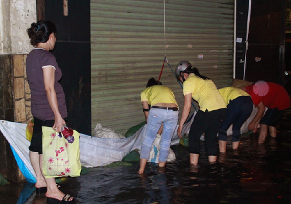 Hai cô gái trong trang phục áo dài truyền thống cùng lội qua nước ngập trên đường Đồng Đen và Hòa Bình.