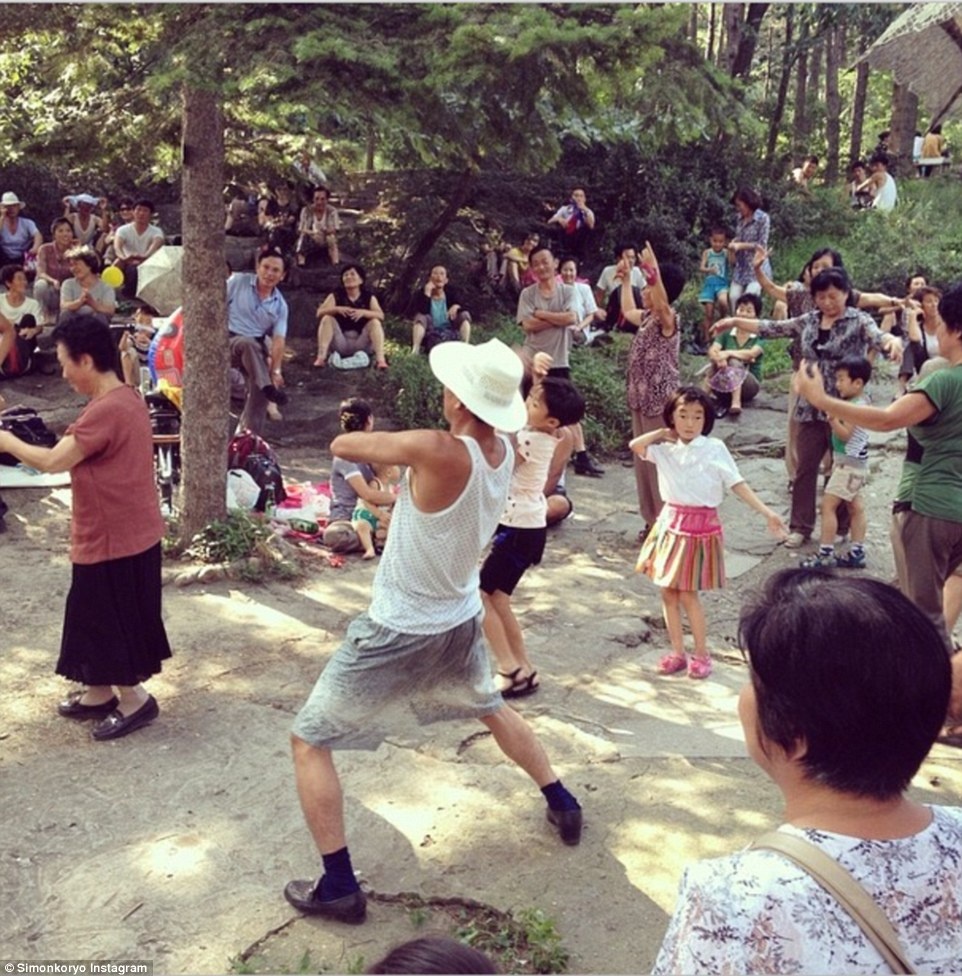 Người dân Triều Tiên nhảy múa trong một công viên Moranbong, thủ đô Bình Nhưỡng. Đây là một trong số các hoạt động ngoài trời tại đất nước vốn rất bí ẩn với thế giới. Hướng dẫn viên du lịch Simon Cockerell của công ty lữ hành Koryo Tours (Anh) đã tới Triều Tiên 140 lần trong 13 năm và chụp tổng cộng 800 bức ảnh về cuộc sống hằng ngày của người dân nới dây.