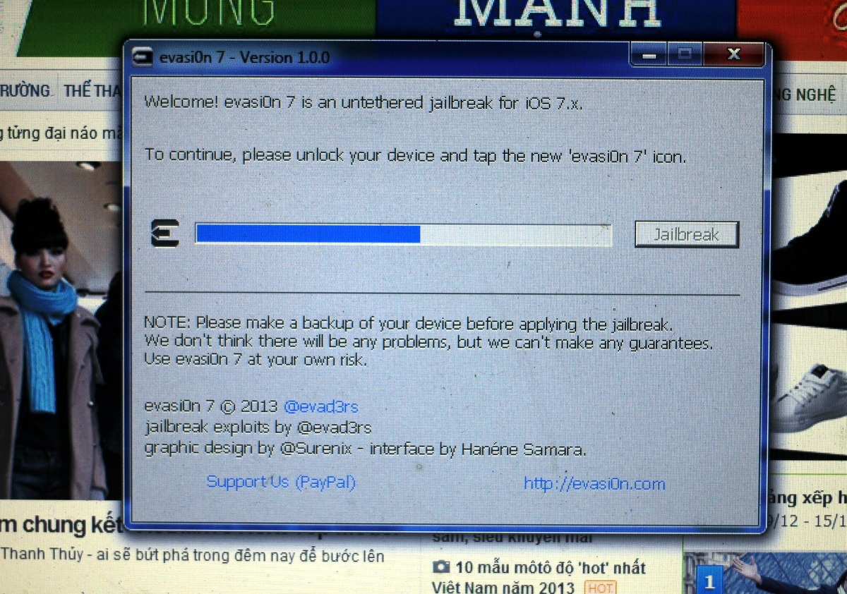 | Sau khi tải ứng dụng Evasi0n, người dùng có thể kết nối iPhone/iPad với máy tính, bấm vào chương trình tải về và tiến hành jailbreak theo hướng dẫn. Quá trình này diễn ra khá nhanh, dưới 10 phút. |