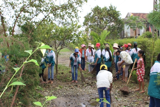 | Các em học sinh kéo đến thu dọn sân vườn nhà Đại tướng, vốn vẫn còn ngổn ngang sau cơn bão số 10. |
