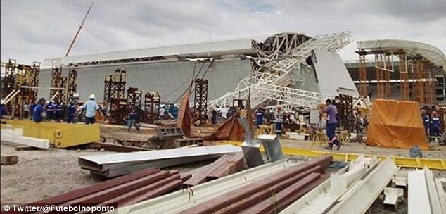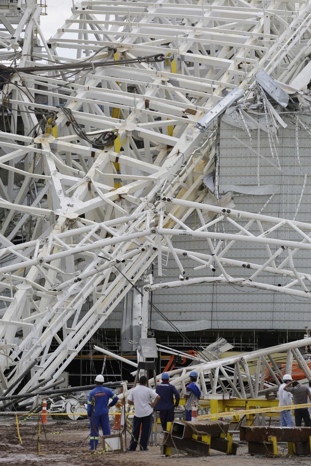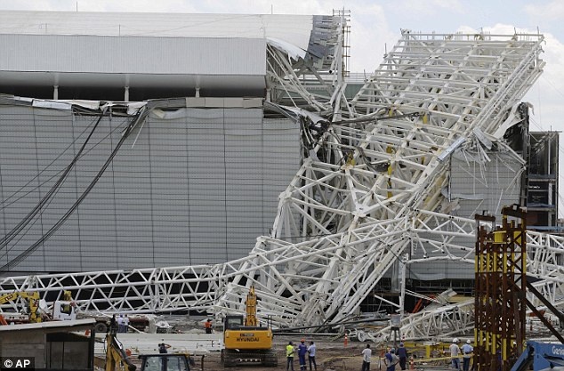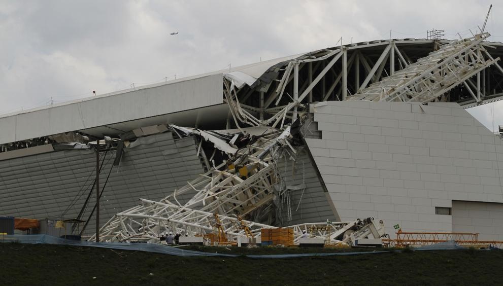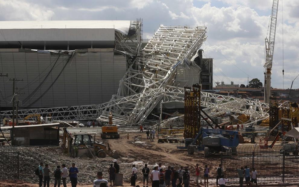 Một chiếc cần cẩu khổng lồ bất ngờ đổ xuống làm sập phần lớn mái và khán đài sân Arena Corinthians-nơi sẽ diễn ra trận khai mạc World Cup 2014.