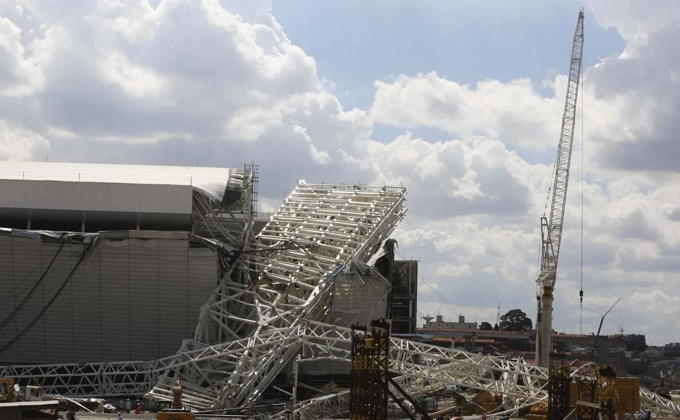 Theo đó, khi mảnh ghép cuối cùng của mái vòm vừa được lắp vào thì một chiếc cần cầu không lồ bất ngờ mất lái, đổ sập xuống một bên khán đài sân vận động đang thi công gây ra hậu quả nghiêm trọng.