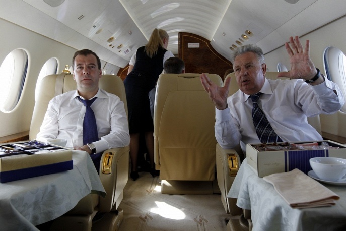 | Phó thủ tướng Nga Dmitri Mevedev trò chuyện cùng ông Viktor Ishayev, đại diện toàn quyền của Tổng thống Nga tại vùng Viễn Đông, trên máy bay. Ảnh: Itar Tass |