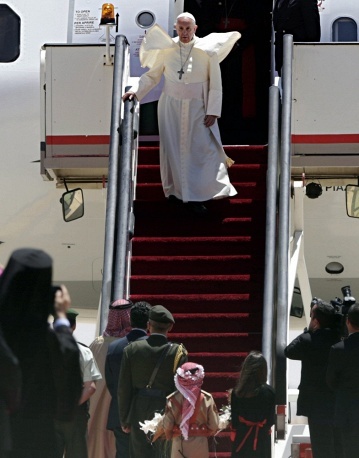 | Quân đội và người dân Jordan đón chào Giáo hoàng Francis khi ông bước xuống máy bay tại phi trường Amman, năm 2014. Ảnh: EPA |