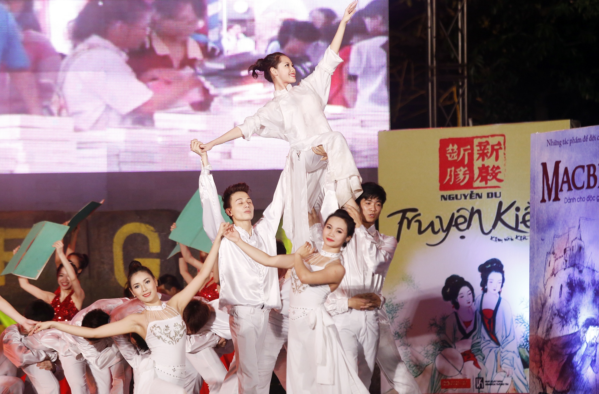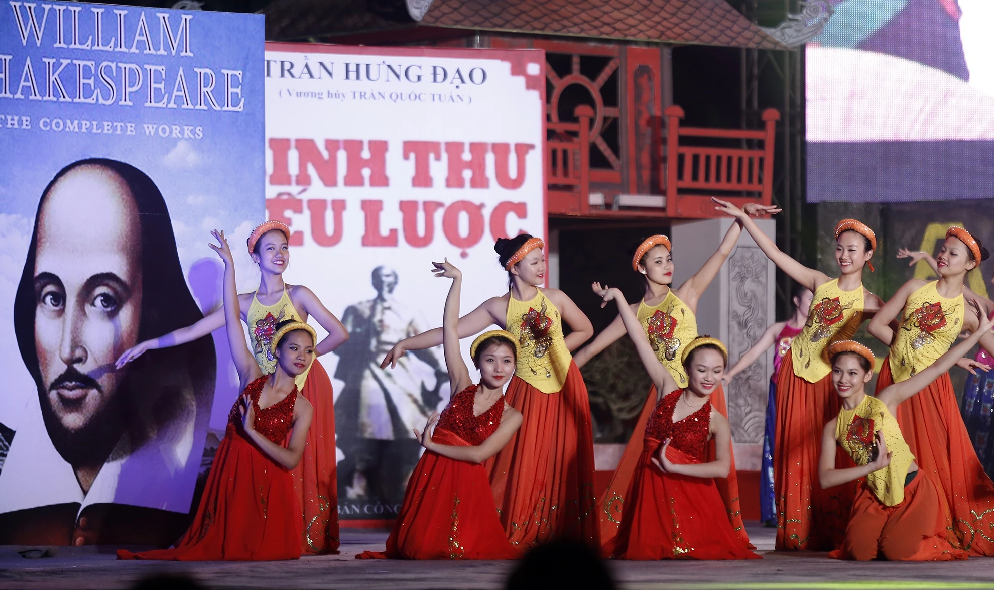 | Sân khấu của buổi lễ được dàn dựng đặc trưng về sách. Hai bên cánh gà là mô hình những tác phẩm, tác giả nổi tiếng thế giới và Việt Nam. |