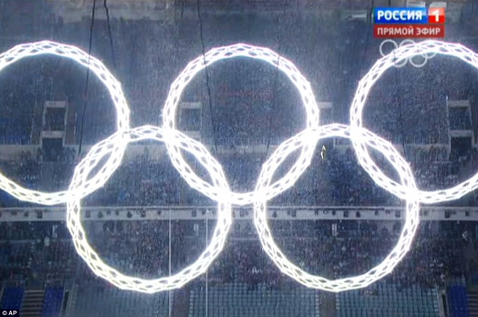 | Một trong năm bông tuyết trắng, tượng trưng cho 5 vòng tròn Olympic đã bị lỗi khi buổi Lễ khai mạc bắt đầu. |