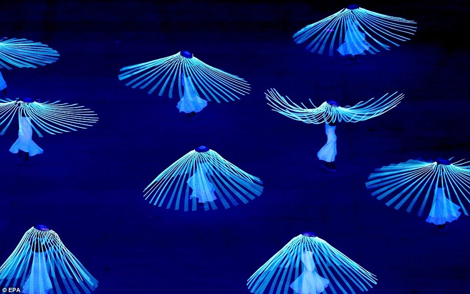 | Các vũ công tạo ra một con chim phát sáng dưới sân vận động. |