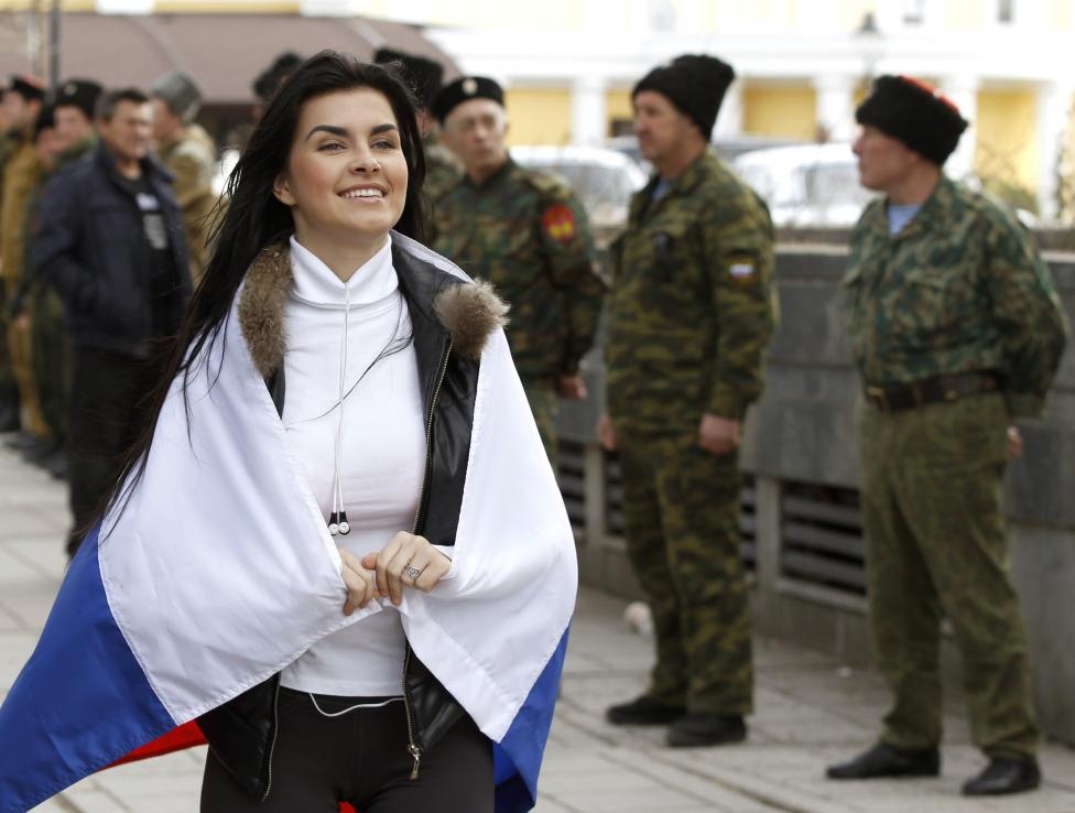 Một phụ nữ khoác lá cờ Nga tham dự mít ting ở Simferopol. Trong quá khứ, Crimea từng là lãnh thổ Nga trước khi được trao cho Ukraine năm 1954. Vùng đất này gắn liền với Nga về văn hóa và lịch sử. |