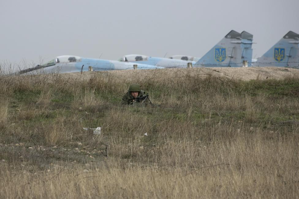 Binh sĩ Nga theo dõi về phía các lính Ukraine ở sân bay Belbek đang tuần hành trong hòa bình để gây áp lực với các tay súng bịt mặt. Phía sau anh là chiến đấu cơ của không quân Ukraine. |