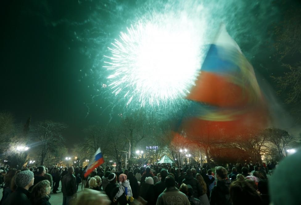 Pháo hoa và cờ Nga trên bầu trời Sevastopol. Sau khi nhận được yêu cầu từ giới chức Crimea, Quốc hội và Tổng thống Nga đã phê chuẩn sáp nhập bán đảo trở thành một phần lãnh thổ của đất nước hôm 18/3. |