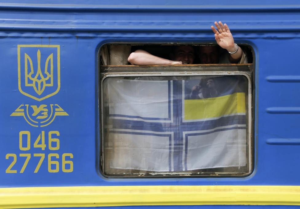 | Đoàn tàu đưa các quân nhân Ukraine rời Sevastopol về Odessa hôm 6/4. Họ phải rời khỏi vùng đất Crimea sau khi nó tách khỏi Ukraine. |