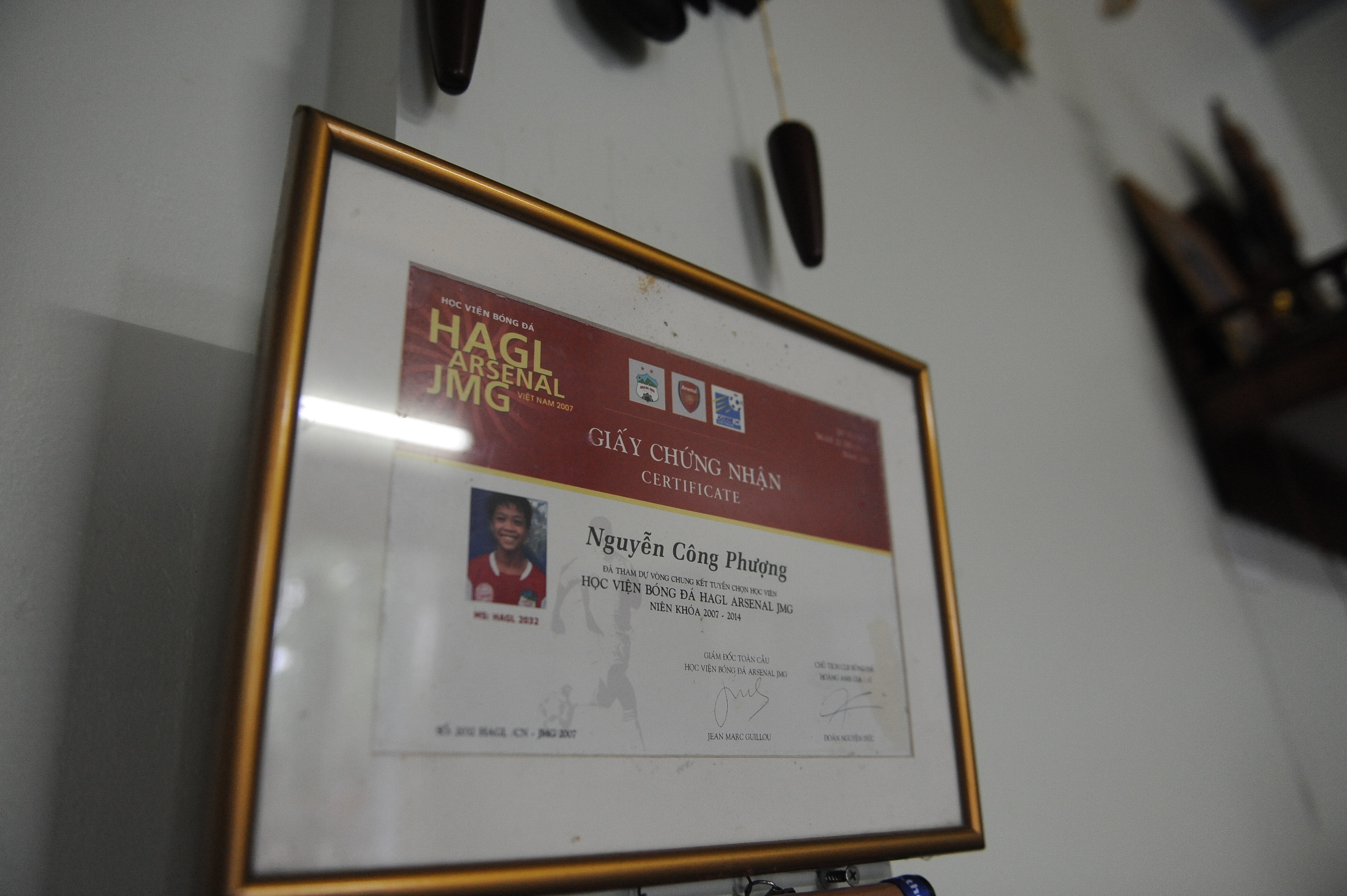 | Hình ảnh Công Phượng trong năm 2014 và giấy chứng nhận trúng tuyển Học viện HAGL Arsenal-JMG được treo ở vị trí trang trọng trong căn nhà mới của gia đình. Giấy chứng nhận trúng tuyển khoá 2007-2014 của Công Phượng do chính Giám đốc Học viện bóng đá Arsenal-JMG ký. |