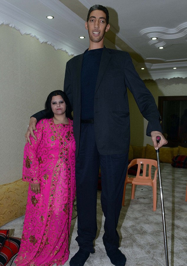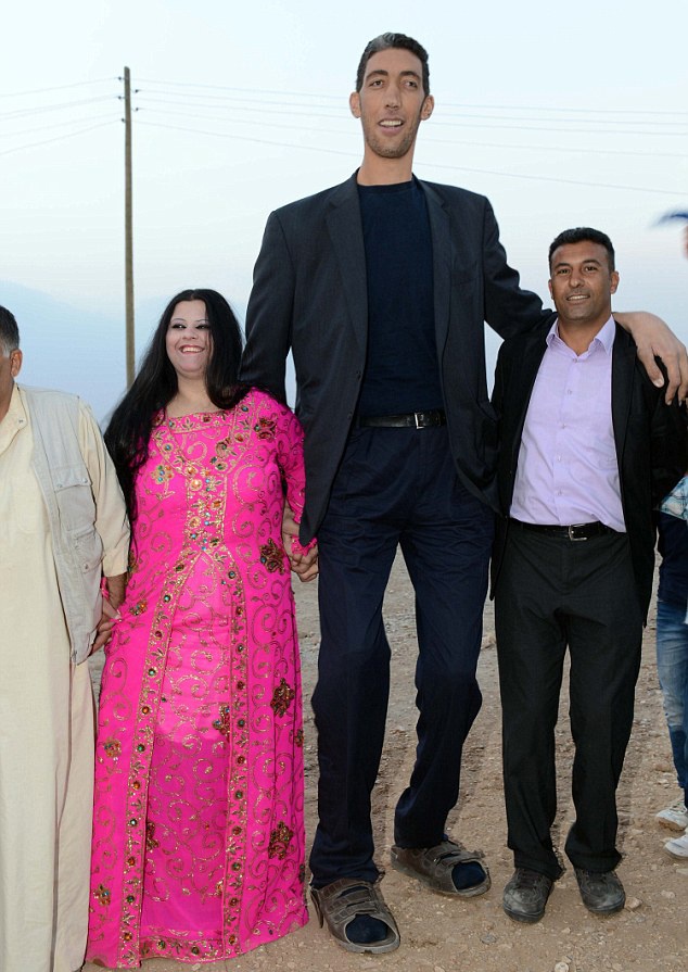 | Cô dâu chú rể bên cạnh họ hàng. Kosen mắc chứng rối loạn tuyến yên hiếm gặp. Cơ thể anh luôn sản sinh ra hormone tăng trưởng chiều cao. Anh được công nhận là người đàn ông cao nhất thế giới năm 2009. Ảnh: Getty. |