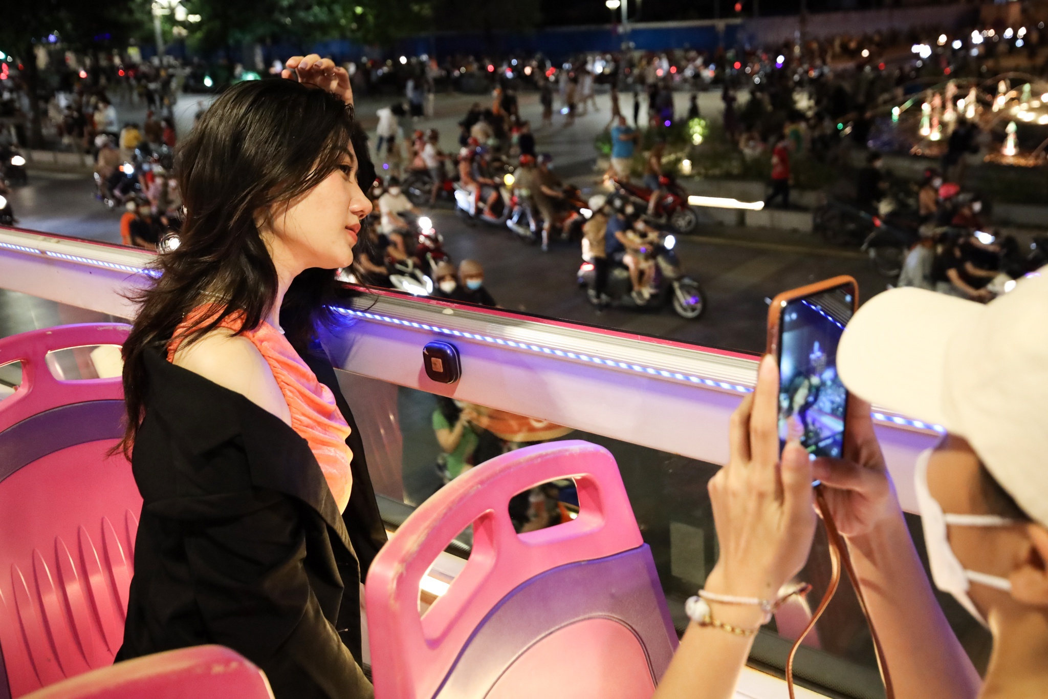 Sau hơn 2 tuần TP.HCM nới lỏng giãn cách xã hội, phố đi bộ Nguyễn Huệ ngày chủ nhật đông đúc xe cộ qua lại. Đây là lần đầu tiên chị Khánh (quận Bình Thạnh) đi xe buýt 2 tầng. Theo chị, cảm giác ngắm nhìn thành phố với view từ xe buýt rất lạ, được nhìn từng dòng xe chạy qua đầy sức sống. Ảnh: Phương Lâm.