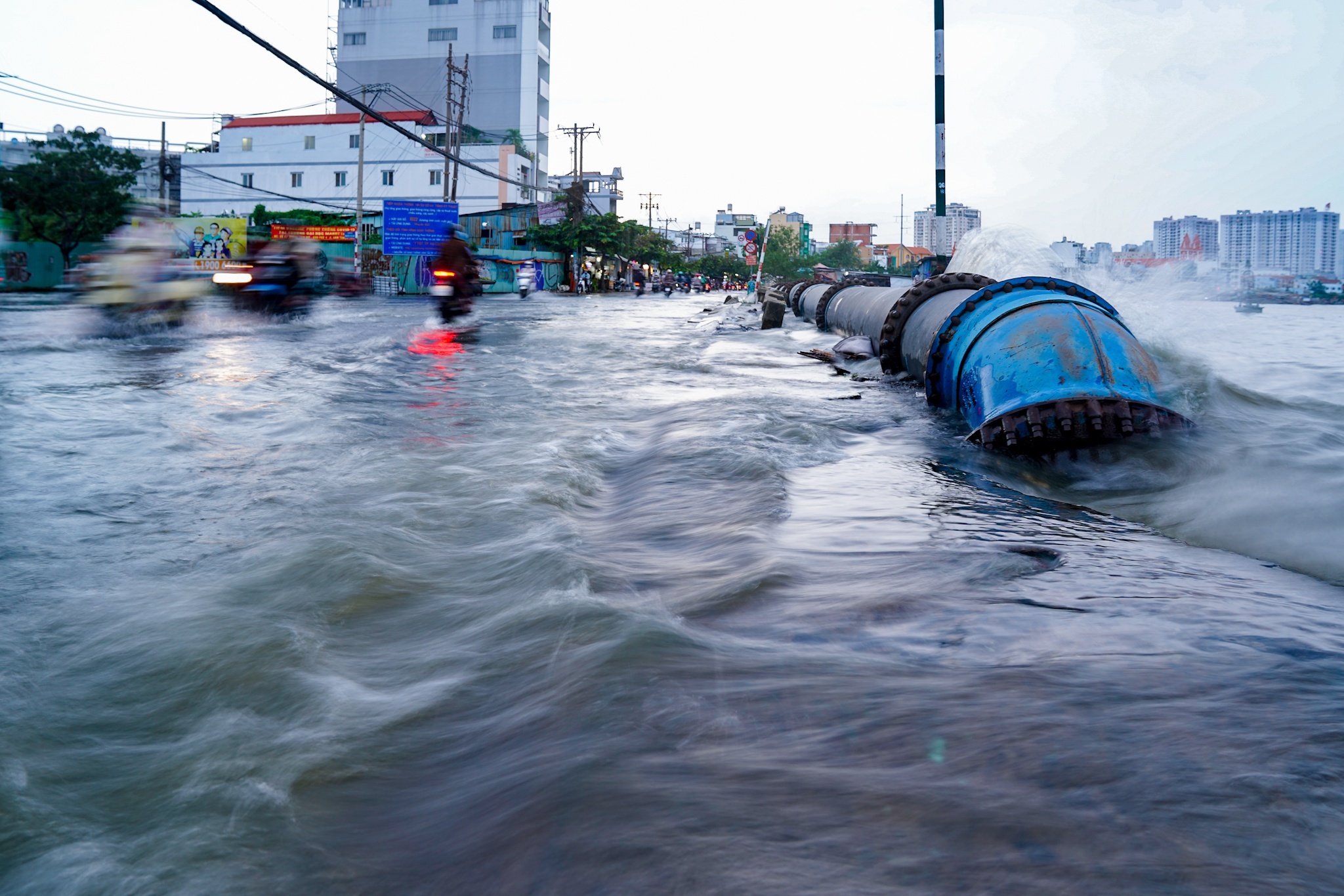 Triều cường trên hệ thống sông Sài Gòn - Đồng Nai dâng cao khiến khu vực trũng thấp ở TP.HCM ngập sâu. Trong ảnh là đường Trần Xuân Soạn, đoạn qua phường Tân Thuận Tây, quận 7, vào chiều 22/10. Ảnh: Chí Hùng.