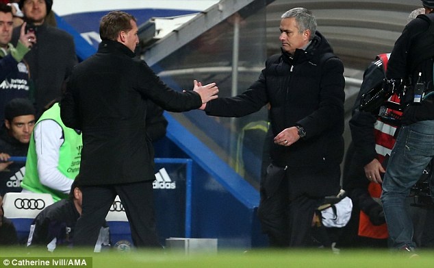 | HLV Mourinho và trợ lý cũ Rodgers trong lần đụng độ trên sân Stamford Bridge. |
