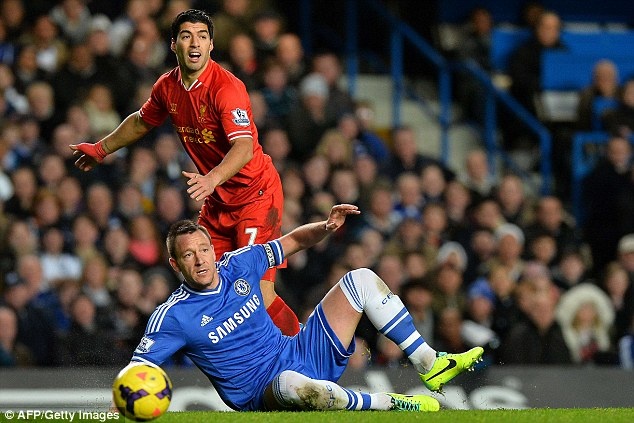 | Trung vệ thủ quân John Terry hoàn thành tốt nhiệm vụ ngăn cản Luis Suarez ghi bàn. |