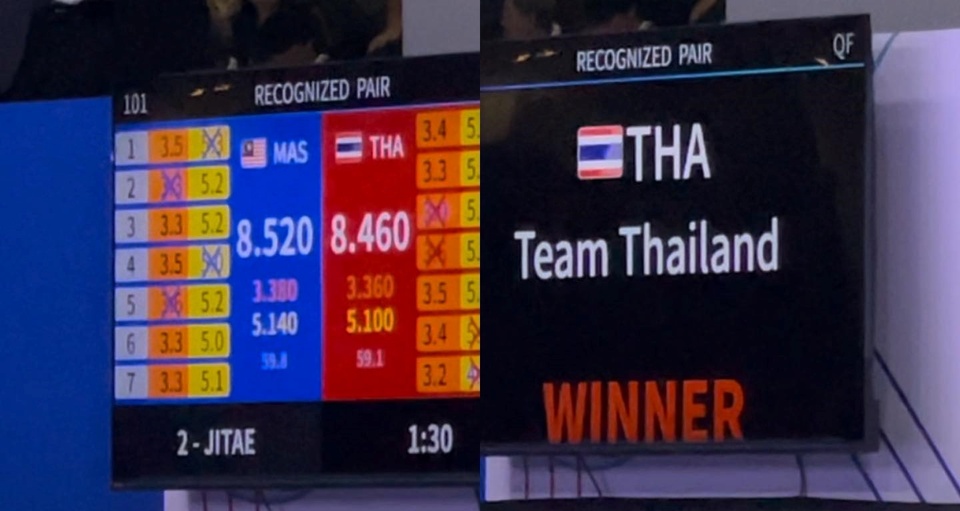 Ban đầu, bảng điểm hiện cặp đôi Malaysia được chấm cao hơn nhưng Thái Lan mới là đội thắng. |