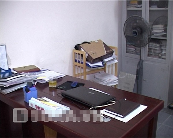 | Bàn làm việc của ông Vũ Quốc Dũng, nguyên Phó giám đốc trung tâm phát triển quỹ đất thành phố Thái Bình vẫn còn nguyên các đồ vật sau vụ xả súng kinh hoàng. |