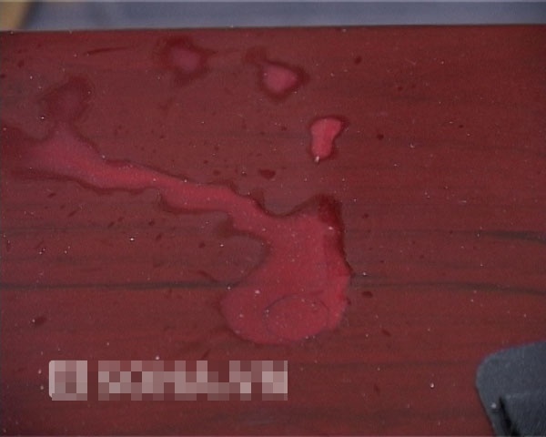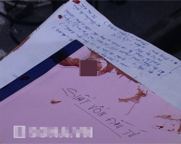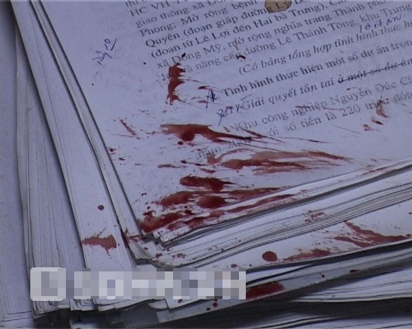 | Không chỉ trên bàn, những vết máu còn thấm đầy trên chồng giấy tờ đặt cạnh bàn làm việc của ông Dũng. |
