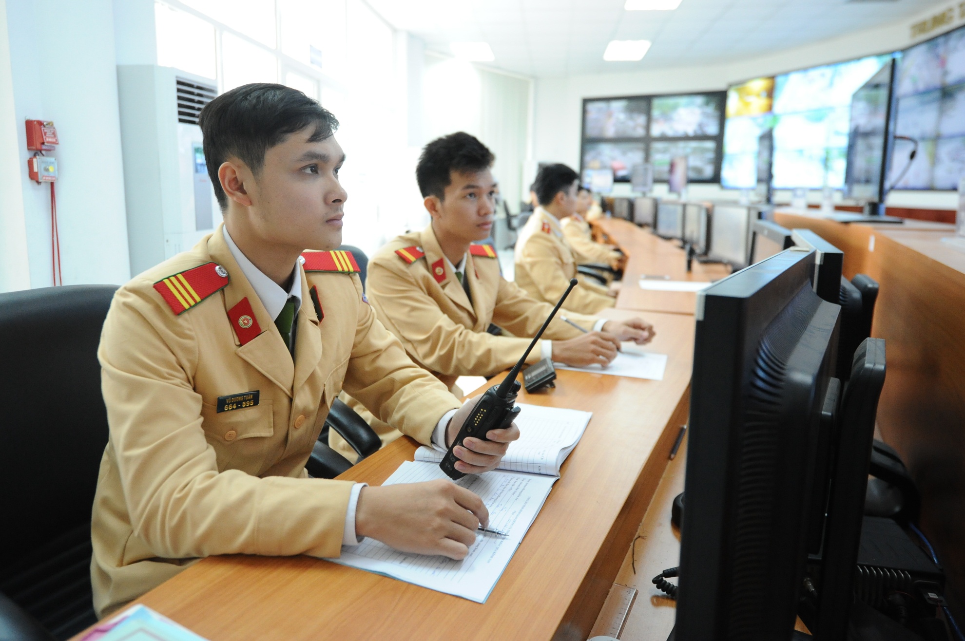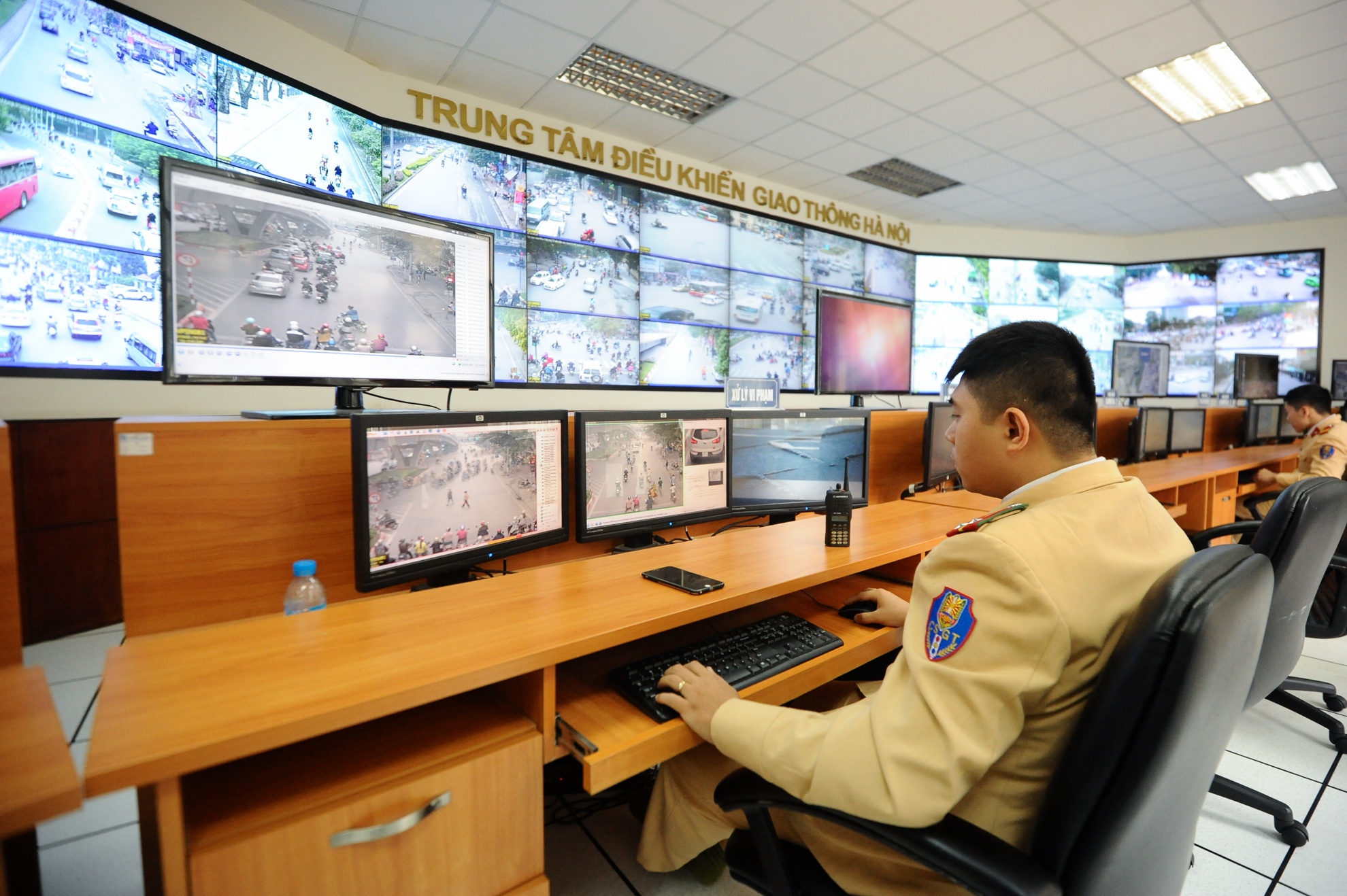 Chiến sĩ cảnh sát tại Trung tâm điều khiển tín hiệu đèn giám sát qua 388 camera theo dõi.