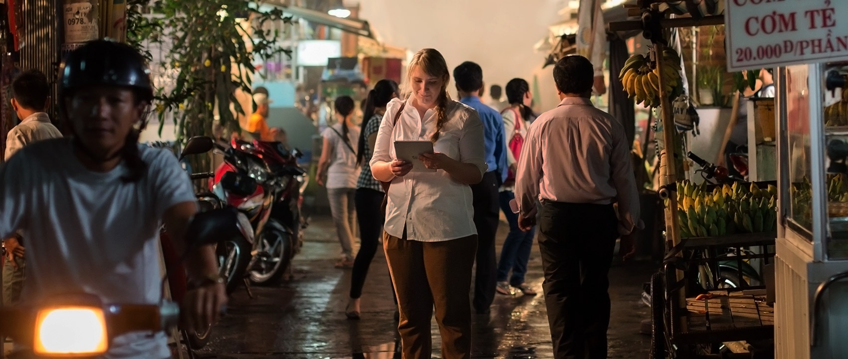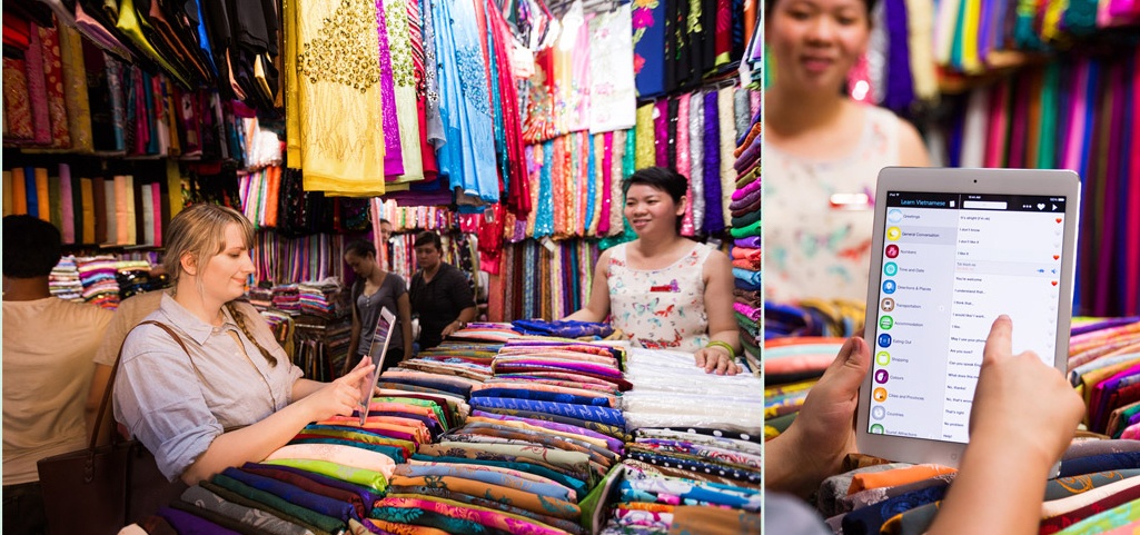 Cô dùng ứng dụng Lear Vietnamese để trò chuyện với các chủ cửa hàng, những người bán hàng rong và người dân địa phương.