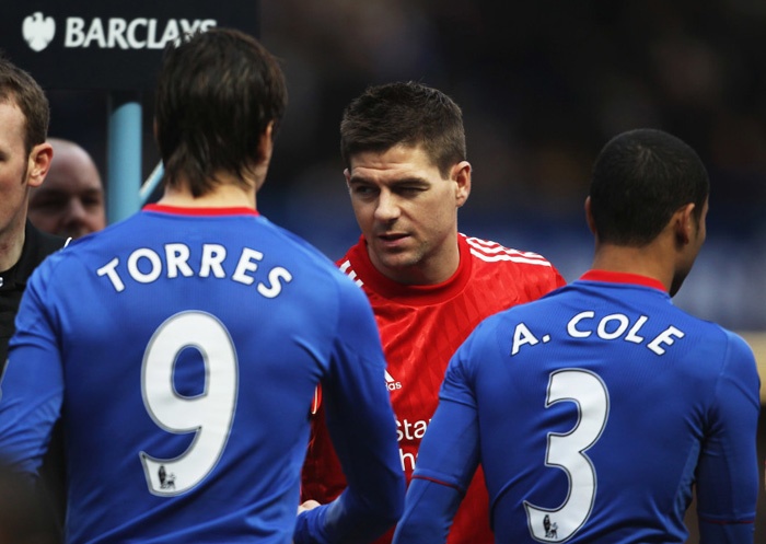 | Lần đầu gặp lại đội bóng cũ, tiền đạo của Chelsea vẫn nhận được sự chào đón của đội trưởng Liverpool, Steven Gerrard. |
