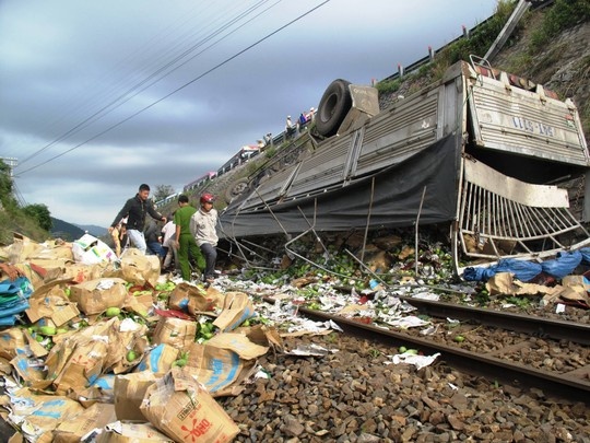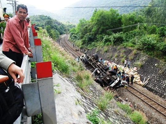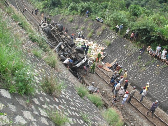 | Trong khi đó, chiếc xe tải kéo lê cả xe máy rơi xuống đường sắt với độ cao 11,5m. Tài xế bị thương nặng, gãy 2 chân. 4 người còn lại bị thương nhẹ. Tất cả đang được cấp cứu ở Bệnh viện Đa khoa Phú Yên. |
