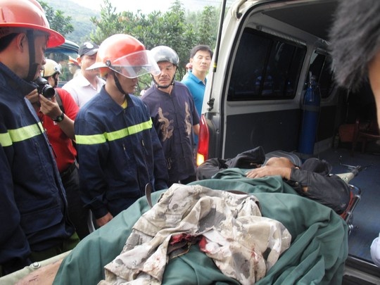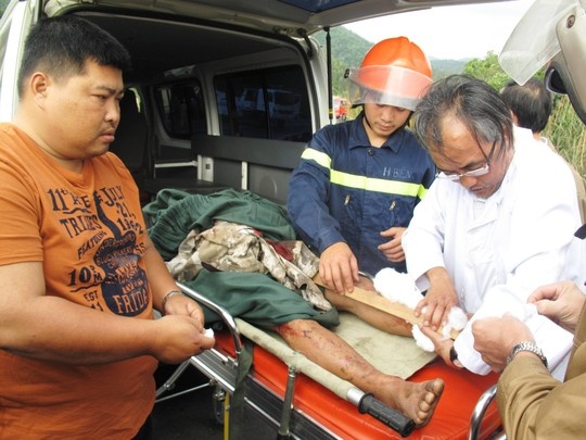 | Tài xế Trung bị gãy 2 chân đang sơ cứu để chuyển đến Bệnh viện đa khoa Phú Yên cấp cứu. Vụ tai nạn khiến đường sắt đoạn qua khu vực này không thể hoạt động. Hơn 10 đoàn tàu đã phải nằm lại các ga thuộc tỉnh Khánh Hòa, Phú Yên. |