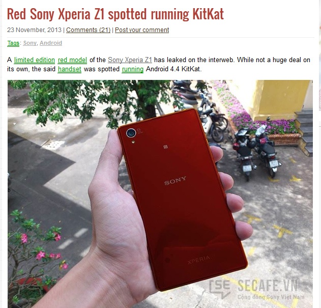 Hình ảnh chiếc Xperia Z1 màu đỏ chạy Android 4.4 KitKat được đăng tải trên fanpage một diễn đàn dành cho tín đồ Sony tại Việt Nam vào hôm qua (22/11) đã thu hút sự quan tâm rất lớn, không chỉ với người dùng trong nước. Lần lượt các trang tin có uy tín tại nước ngoài như GsmArena, PhoneArena, Android Authority hay Xperia Guide đều dẫn lại nguồn tin nói trên tại trang chủ của mình vào sáng nay (23/11).