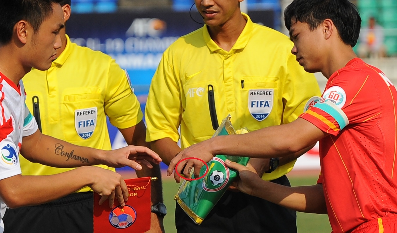 Lứa cầu thủ trẻ U19 Việt Nam có vẻ không thích trào lưu đó. Tuy vậy không thích không của nghĩa là không xăm, người hâm mộ U19 Việt Nam có lẽ ít để ý đến chi tiết nhỏ trên kẽ bàn tay trái của Công Phượng. Đội trưởng U19 Việt Nam trong những lần bắt tay đội bạn và tổ trọng tài điều khiển trận đấu đã nhiều lần để lộ hình xăm kín đáo ở vị trí kẽ tay ngón đeo nhẫn.