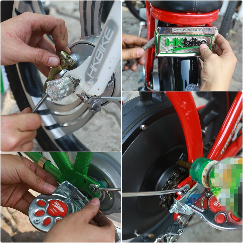 Người dùng chỉ cần làm duy nhất một việc là mang xe tới showroom chính hãng định kỳ 3 tháng một lần để nhân viên kỹ thuật kiểm tra, tân trang và bảo dưỡng lại toàn bộ xe cho bạn. Gói dịch vụ tân trang xe đạp điện của HKbike bao gồm: bảo dưỡng, thay thế phụ tùng trực tiếp tại showroom, tra dầu, thay ốc, nâng yên, đánh bóng, cân chỉnh phanh, tăng xích, kiểm tra nguồn điện, rửa xe tại các địa điểm được đại lý bố trí sẵn... Đặc biệt, khách hàng sẽ được thay thế phụ kiện chính hãng (trừ pin) chỉ với giá gốc khi có nhu cầu.