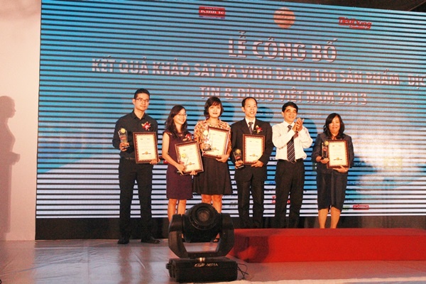 | Đại diện HKPhone (ngoài cùng bên trái) tại lễ công bố kết quả khảo sát và vinh danh 100 sản phẩm - dịch vụ Tin & và Dùng Việt Nam 2013. |