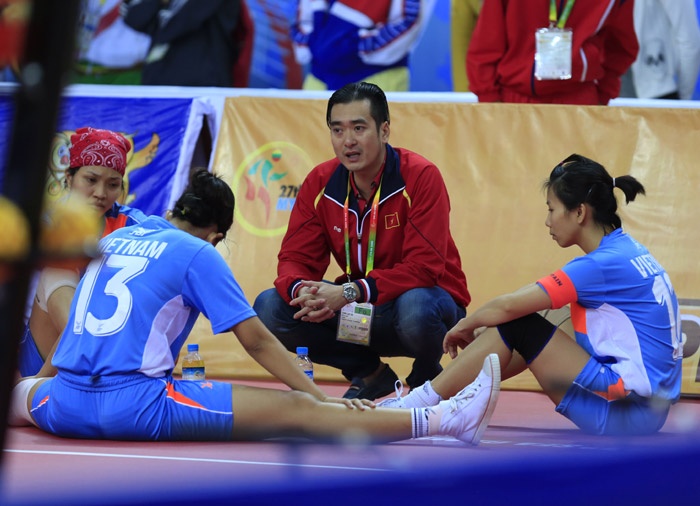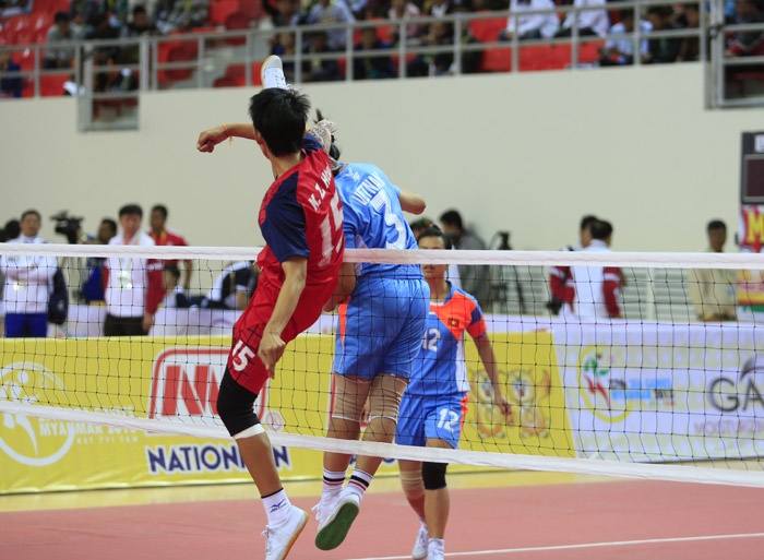| Đội Việt Nam phải thắng Myanmar mới có cửa giành HCB regu nữ. Trong trận đấu này, trọng tài có đôi chút thiên vị cho chủ nhà. Điển hình như những tình huống VĐV của Myanmar đưa chân sang phần sân của Việt Nam chắn bóng, chạm mép lưới. |