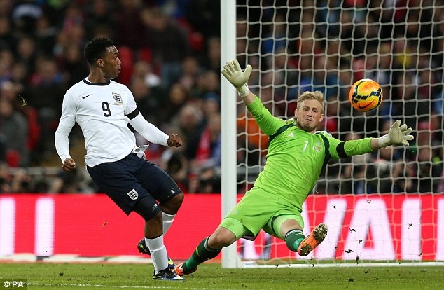| Sturridge bỏ lỡ một cơ hội rất ngon ăn trước khung thành Kaspe Smeichel. Ảnh: PA |