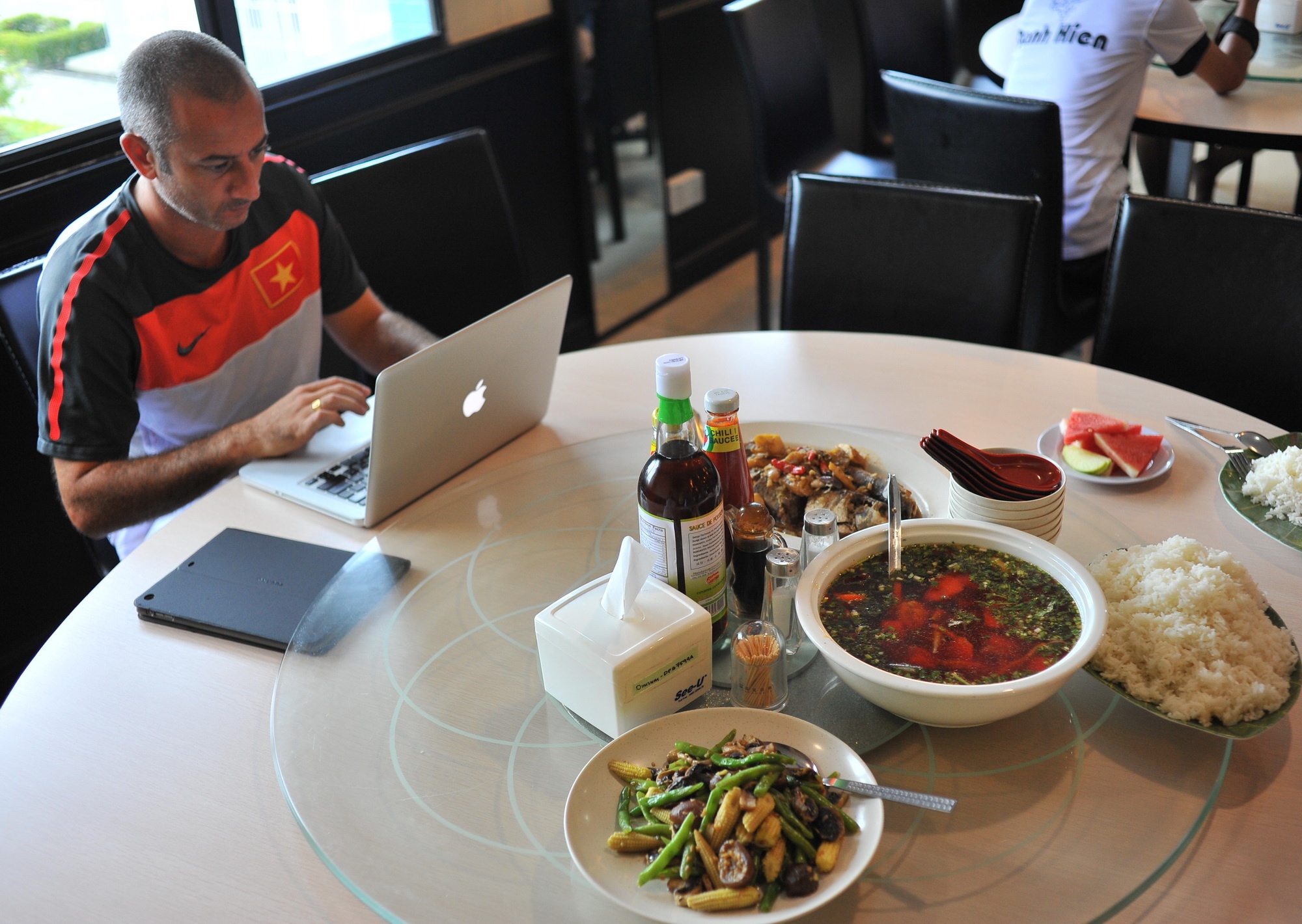 Tới 20h30 tối qua mới thấy sự xuất hiện của HLV Graechen ở phòng ăn. Ông hào hứng kể về các đối thủ khác tại VCK U19 châu Á như đội bóng nào có tới 5 cầu thủ gốc châu Phi, đội bóng nào có những nhân tố xuất sắc nhưng nghi ngờ là quá tuổi...
