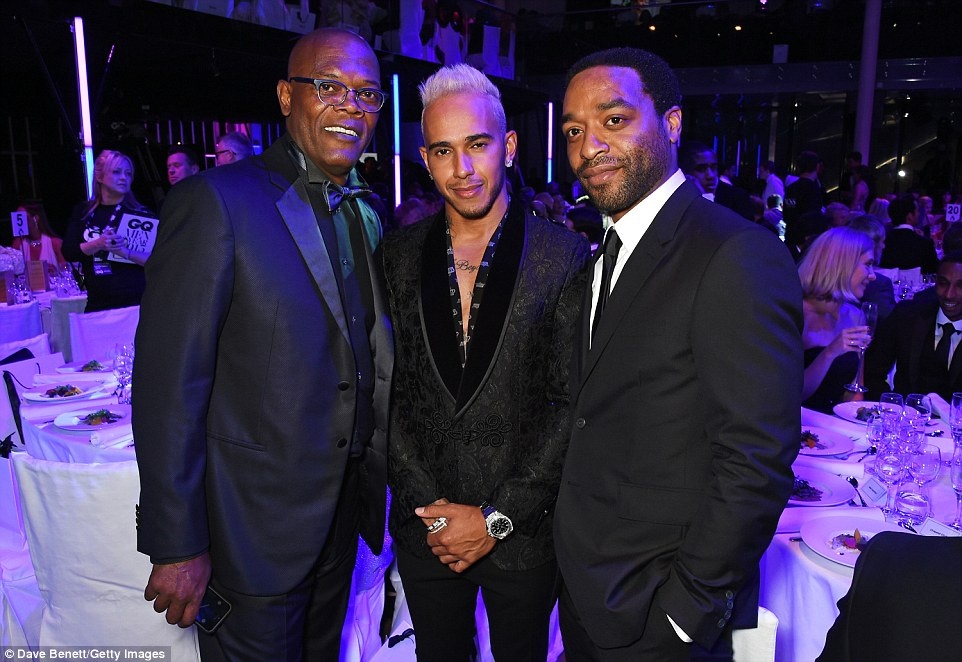| Ngôi sao công thức 1, Lewis Hamilton (giữa) chụp ảnh cùng hai nam diễn viên Samuel L. Jackson (trái) và Chiwetel Ejiofor trong bữa tiệc tối. |