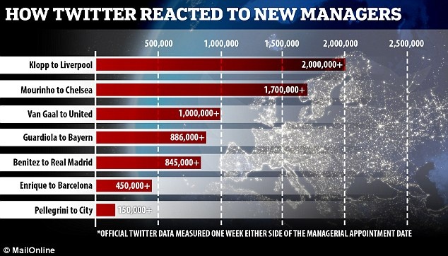 Pep Guardiola tới Bayern (2013) hay Rafa Benitez dẫn dắt Real Madrid (2015) cũng thu hút sự quan tâm lớn từ người hâm mộ trên toàn thế giới. Tuy nhiên, số lần chia sẻ về sự kiện này trên Twitter vẫn chưa bằng một nửa so với việc Juergen Klopp tới làm việc tại Anfield.