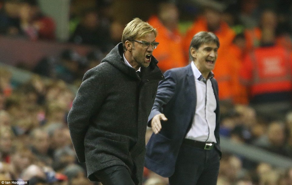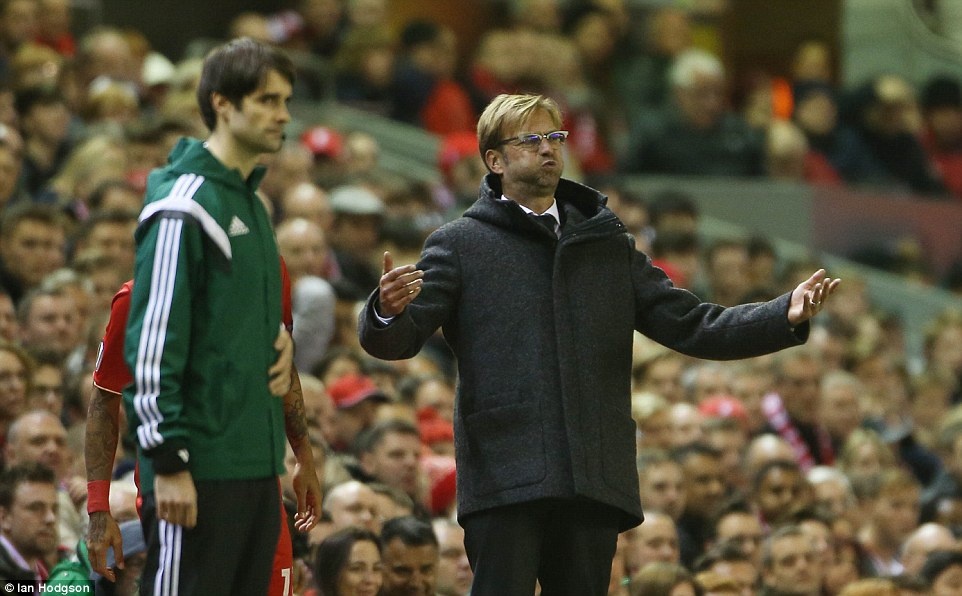 | Huấn luyện viện Juergen Klopp không hài lòng với tinh thần thi đấu của học trò. Tân thuyền trưởng người Đức thường xuyên ra mép đường biên để chỉ đạo. |