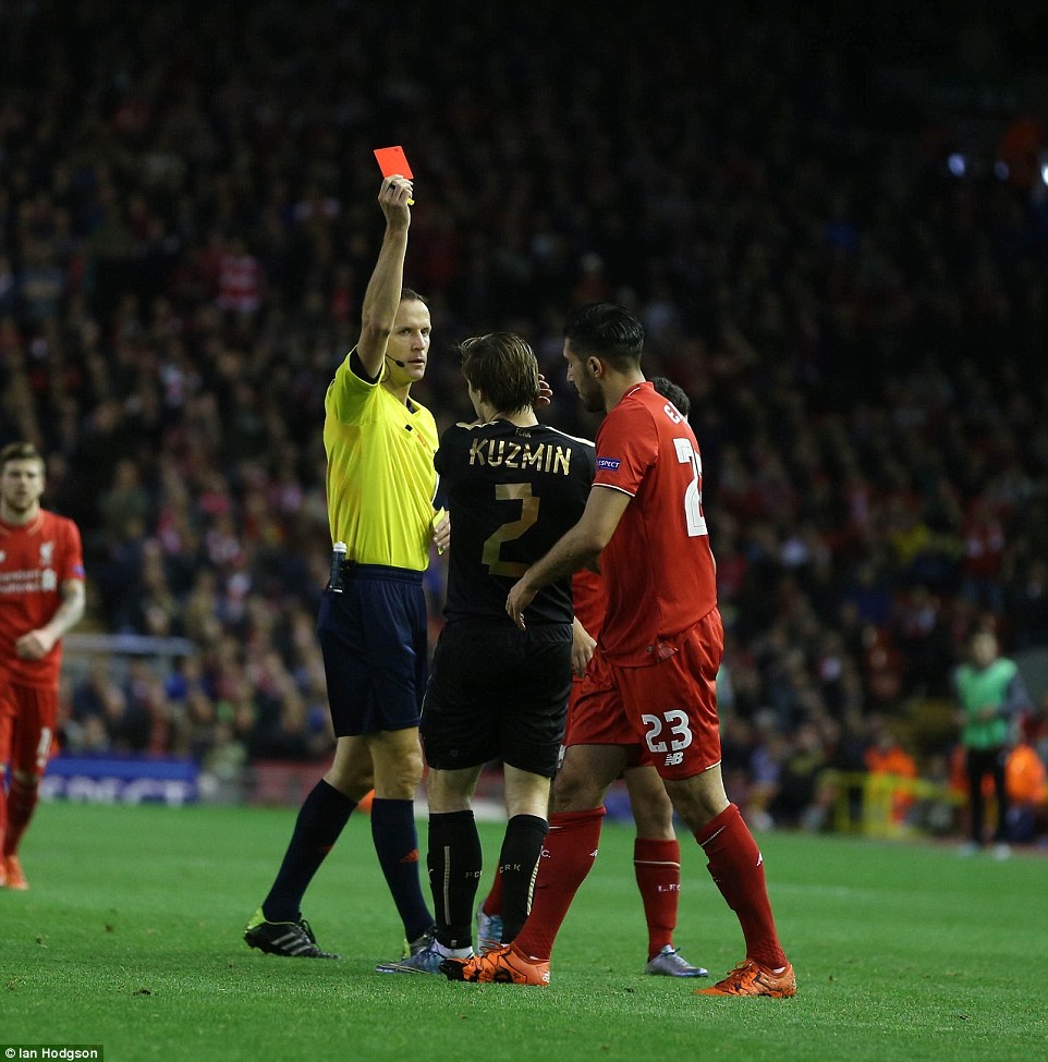 | Rubin Kazan gặp tổn thất lớn về lực lượng khi hậu vệ Kuzmin nhận thẻ vàng thứ hai vì truy cản trái phép pha lên bóng của Emre Can phút 36. |