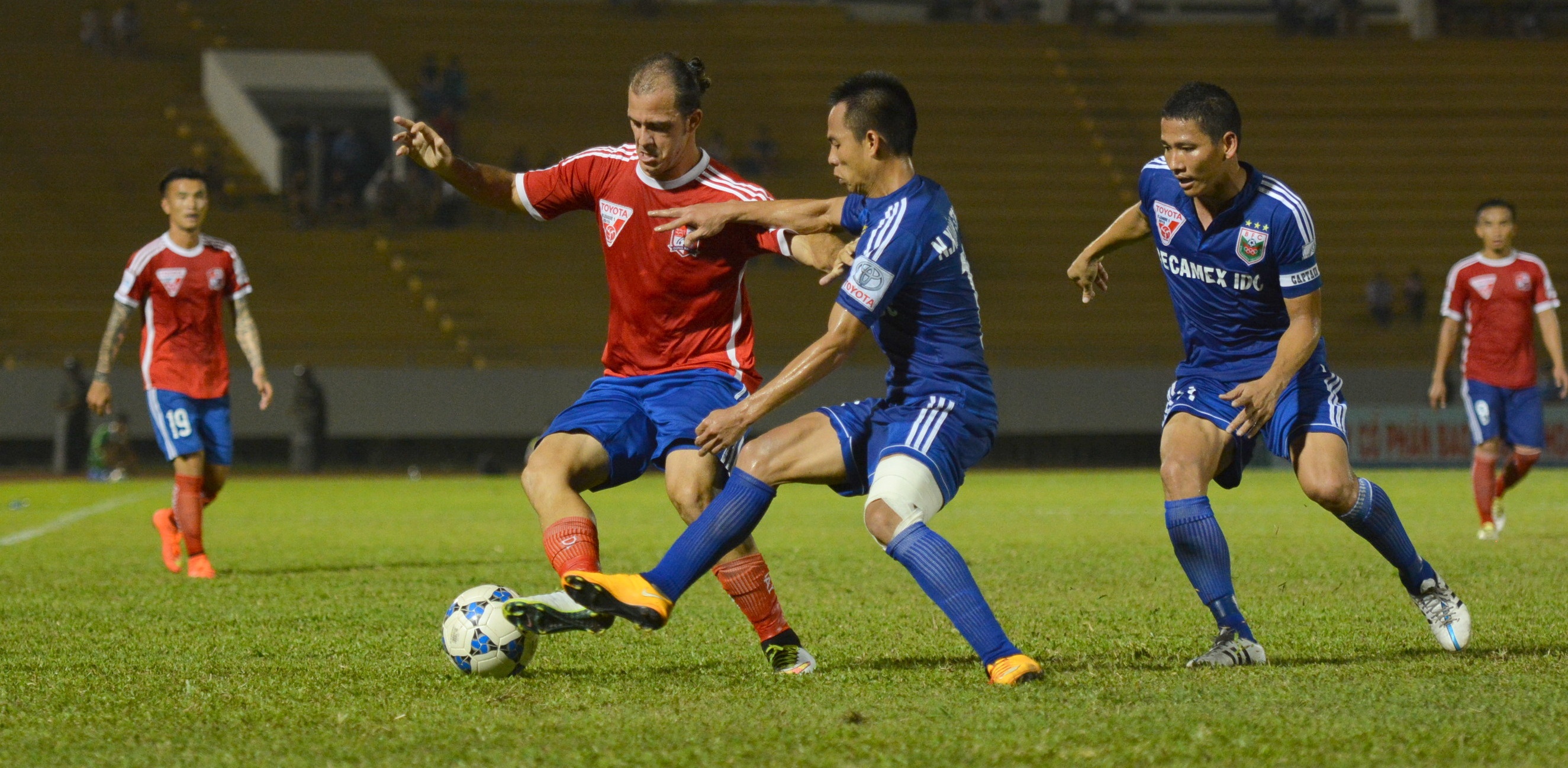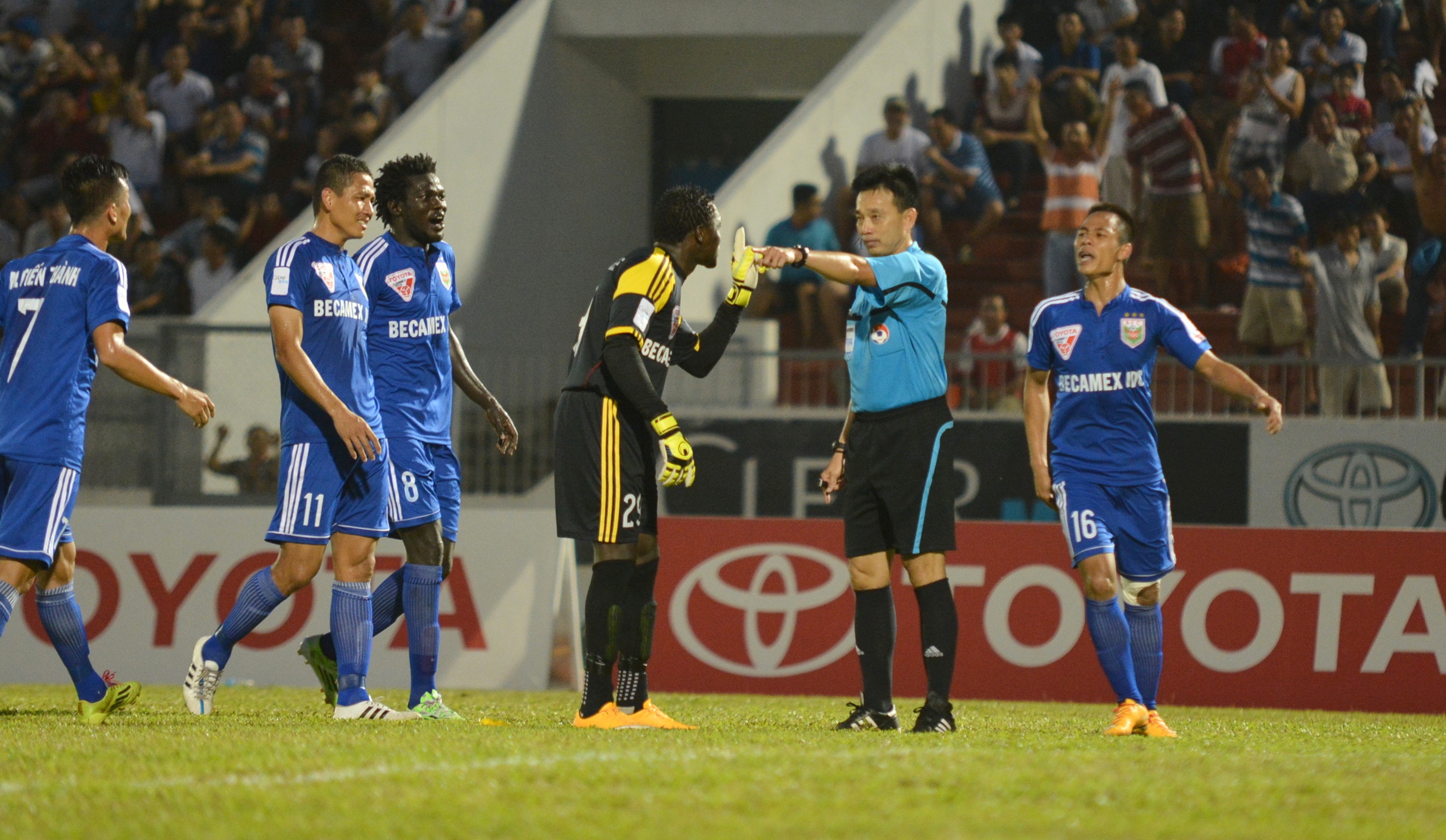 | Phút 40, B.Bình Dương chiụ thiệt thòi lớn khi tiền đạo Nguyễn Tăng Tuấn nhận thẻ vàng thứ 2 rời sân sau pha phạm lỗi với Hồng Việt. Trọng tài Võ Minh Trí rất mạnh tay với những lỗi của cầu thủ 2 đội. |