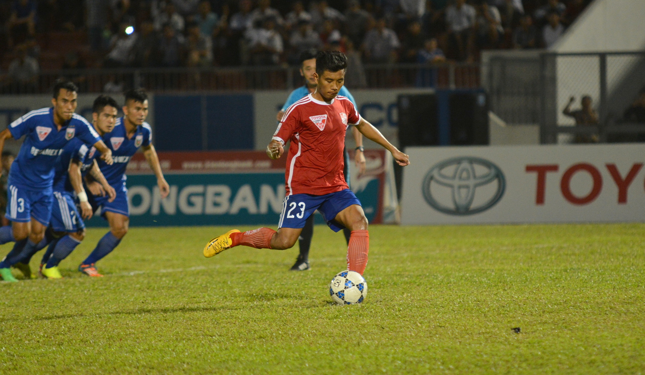 | Phút 54, trọng tài Võ Minh Trí cho Đồng Nai được hưởng quả penalty gây tranh cãi khi Ngô Đức Thắng ngã trong vòng cấm. |