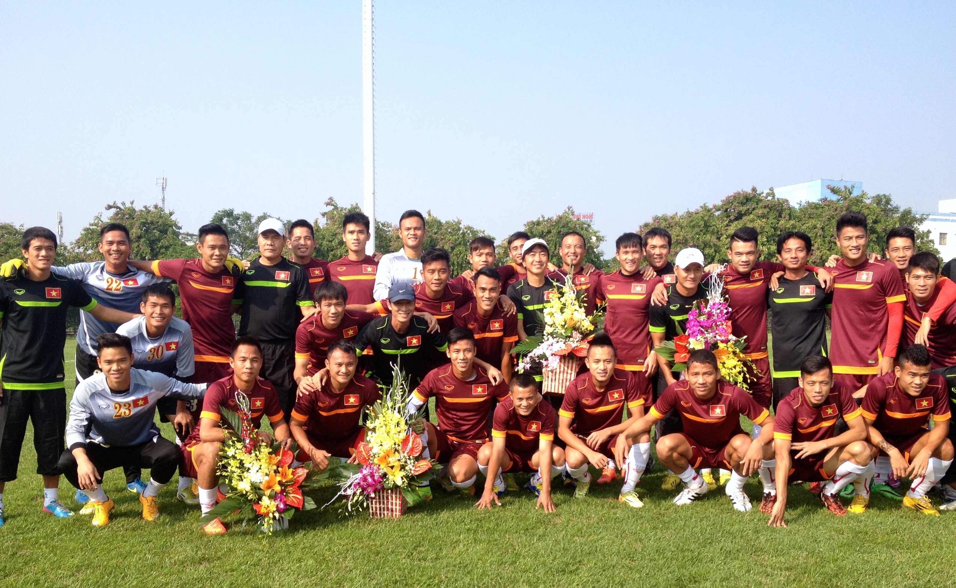 | HLV Miura nói: "Trong đời huấn luyện của mình, tôi chưa bao giờ nhận được món quà như thế này trong ngày có ý nghĩa về tình thầy trò. Tôi rất hạnh phúc và cảm ơn các bạn. Và tôi hi vọng các bạn sẽ thi đấu thật tốt tại AFF Suzuki Cup 2014 để tặng tôi món quà lớn hơn, đó là chiếc Cúp vô địch" |