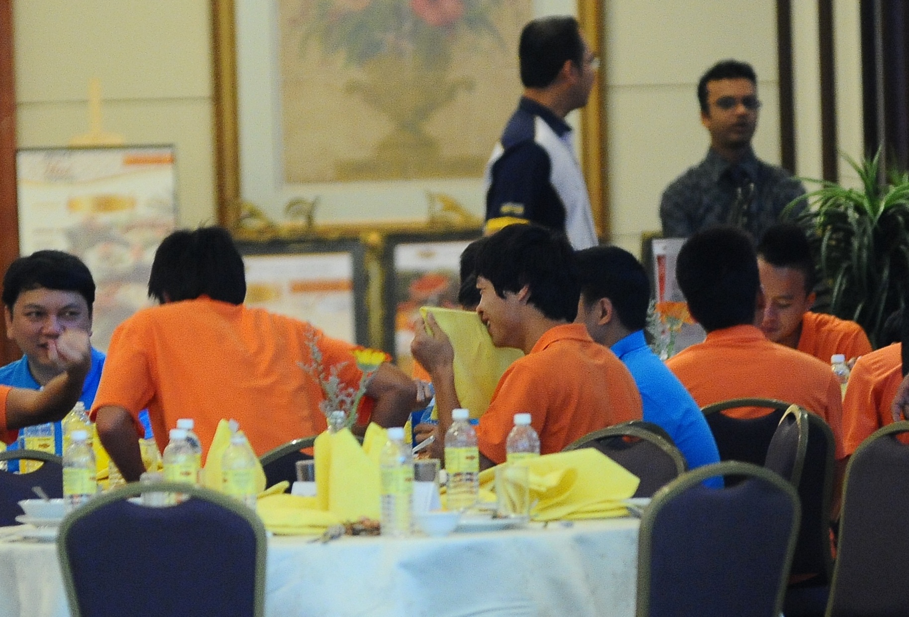 | Công Phượng cùng các đồng đội dùng bữa trưa tại khách sạn Grand Bluewave. |