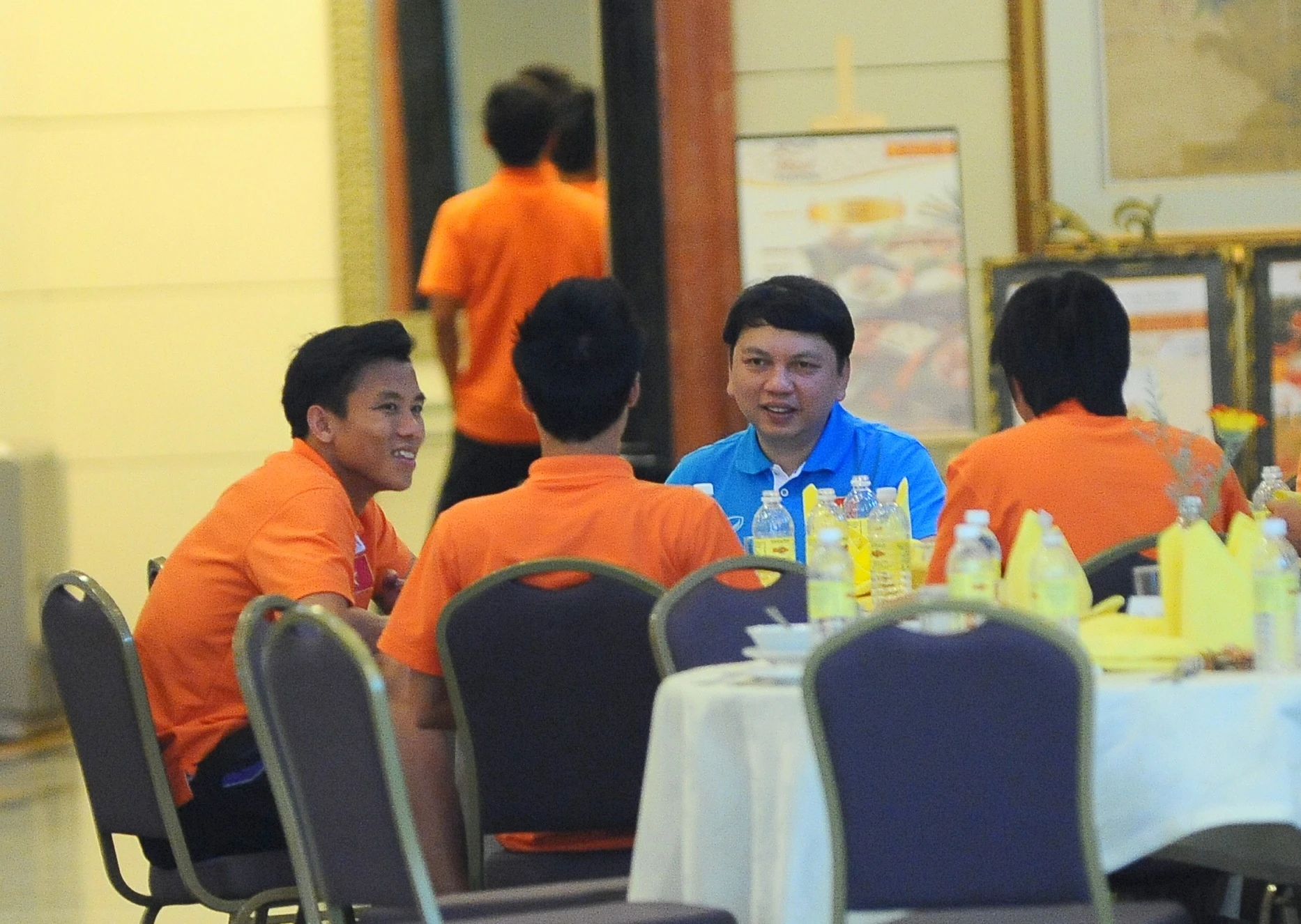 | Tổng thư ký VFF, ông Lê Hoài Anh khích lệ các cầu thủ trong bữa ăn trưa cùng toàn đội. |