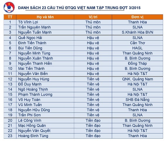 Ngoài nhiều gương mặt quen thuộc từ các đợt tập trung trước đây, 2 cái tên lần đầu được HLV Miura triệu tập là tiền đạo Đình Tùng (CLB Thanh Hóa) và thủ môn Tuấn Mạnh (CLB Khánh Hòa).