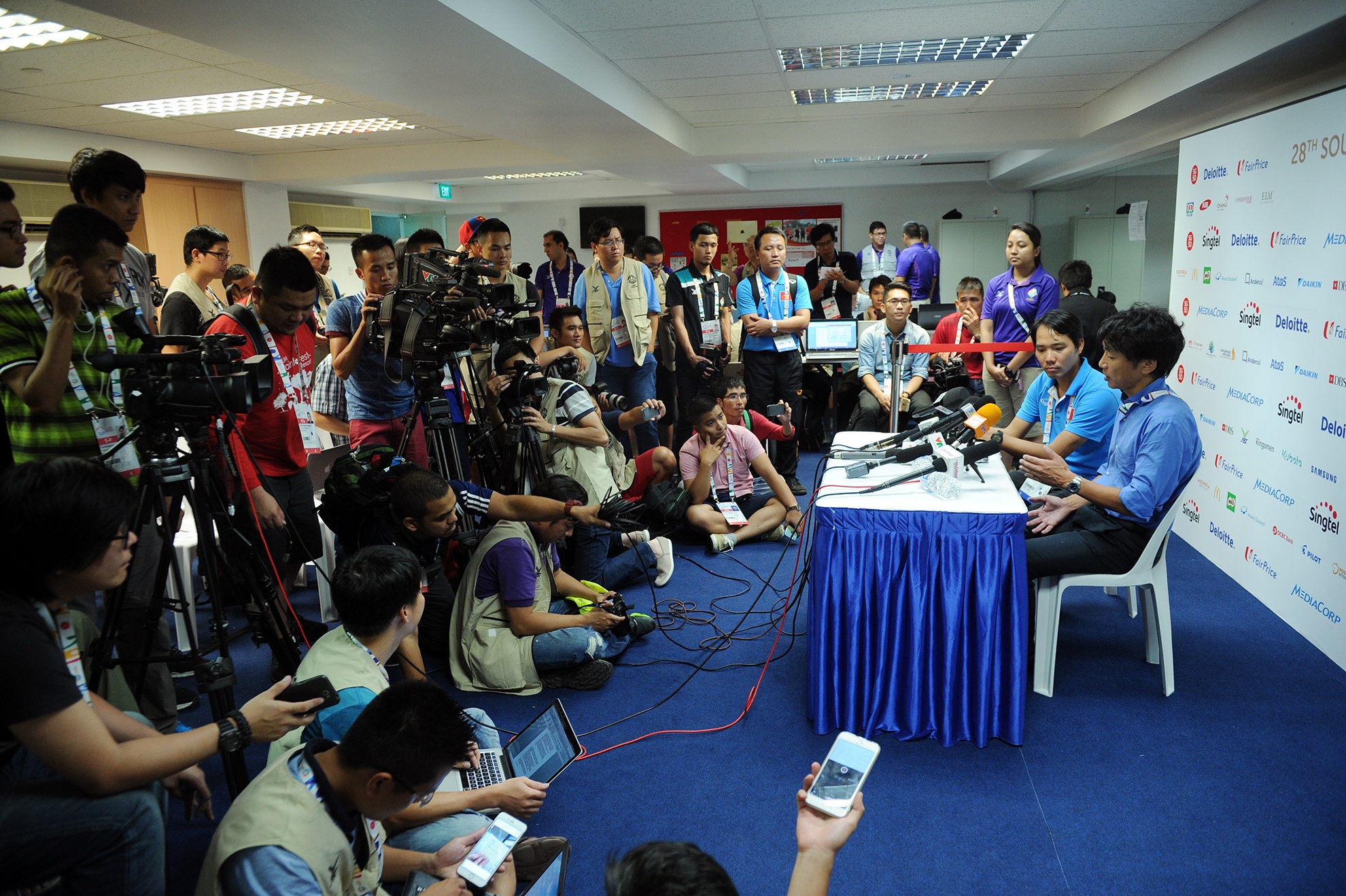 | HLV Miura trong vòng vây của báo giới sau trận đấu. Ảnh: Anh Tuấn. |